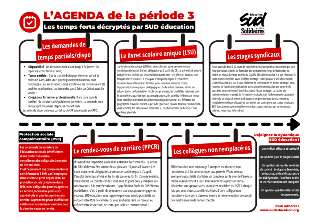 1er et 2nd degré – Agenda de la P3 Publié 14 janvier 2026 Par solidaires91 agenda-periode-3-2026-1024×724Télécharger Partager : Cliquer pour partager sur X(ouvre dans une nouvelle fenêtre) X Cliquez pour partager sur Facebook(ouvre dans une nouvelle fenêtre) Facebook J’aime chargement… Similaire Publié par solidaires91 Voir tous les articles par solidaires91