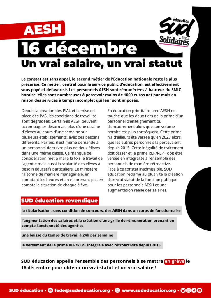 mobilisation des AESH le 16 décembre 2025 Publié 14 janvier 2026 Par solidaires91 Partager : Cliquer pour partager sur X(ouvre dans une nouvelle fenêtre) X Cliquez pour partager sur Facebook(ouvre dans une nouvelle fenêtre) Facebook J’aime chargement… Similaire Publié par solidaires91 Voir tous les articles par solidaires91